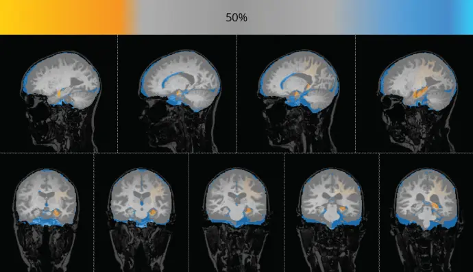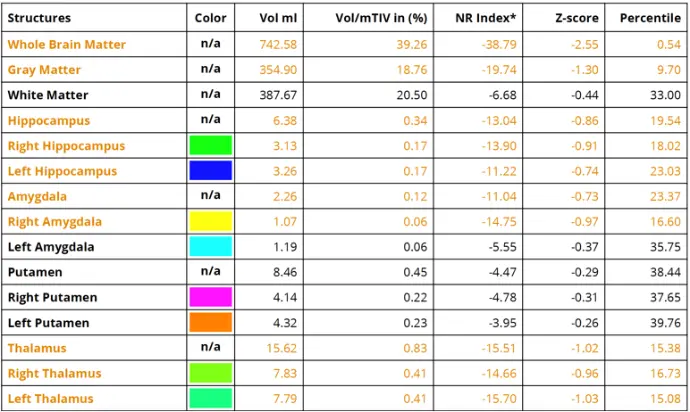 - Brain volume assessment of 64+ volumes (mL, percentiles, Z-scores, etc.)